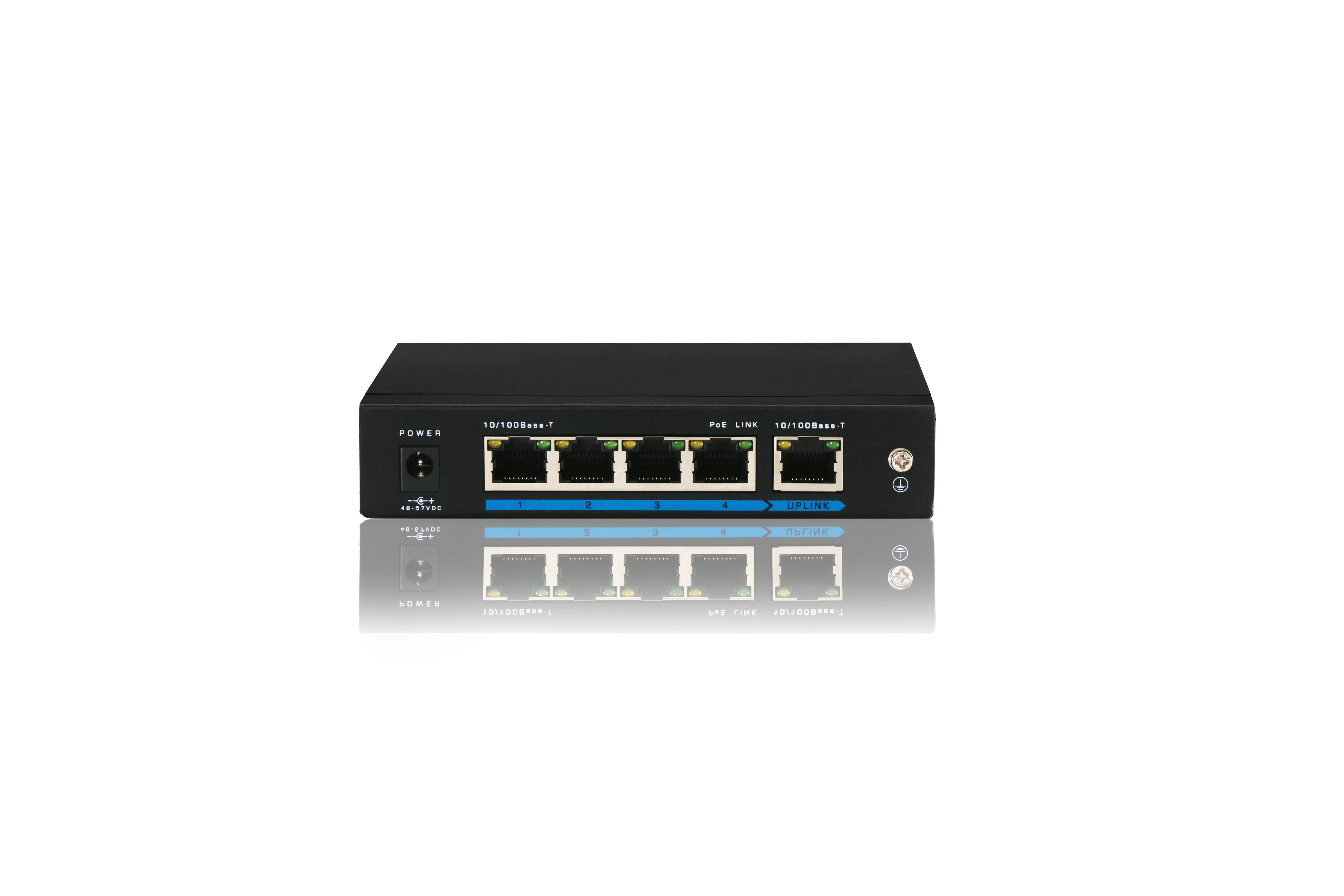 1. 5x 10/100Mbps auto-sensing RJ45 ports, 4x 10/100Mbps PoE ports, 1x uplink port;
