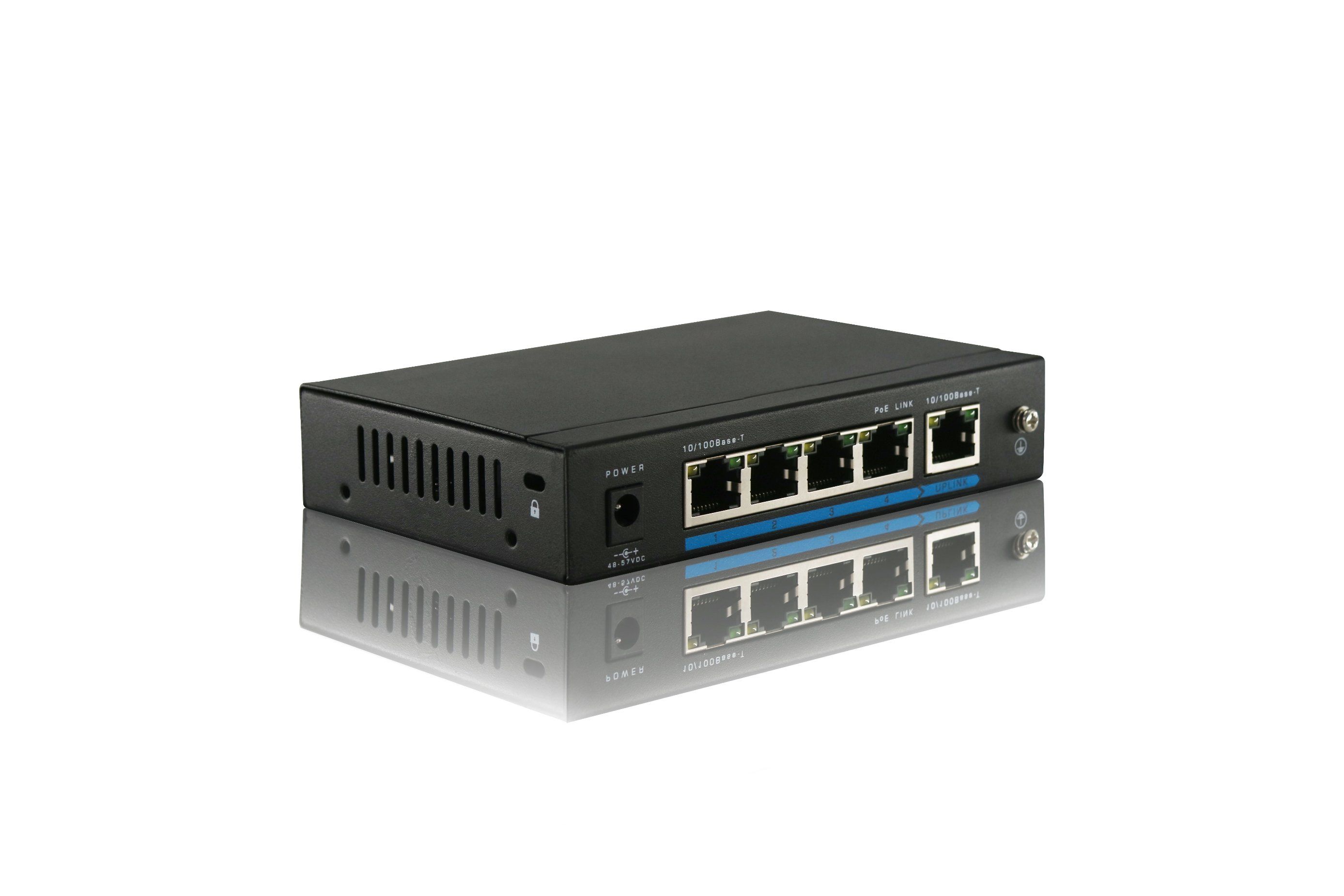 The DF-4EP+1E-A(65W) is a compact 4 port POE switch, 4 ports PoE Ethernet Switch is security surveillance Ethernet Switch which aims at Ethernet high definition surveillance and security system. The product fully combines the characteristics of security surveillance, provides fast packet forwarding ability and abundant backplane bandwidth, which ensures clear image and fluent transmission.The product supports one key Camera model, with VLAN function can restrain the network storm, protect the information security, prevent the viral transmission and cyber attack, fully satisfy the Ethernet video security surveillance system and Ethernet project needs.