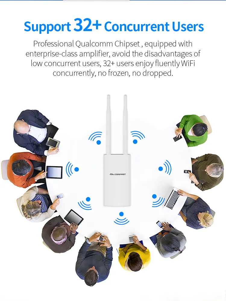 Product descriptionSpecification300Mbps outdoor 4G LTE wireless AP Hardware SpecifificationQualcomm, QCA9531+EC25;DDR: 64MB; Flash: 16MB;PA Chipset: 2.4G SKY85330-11 *2;Support for the maximum number of users: 90Antenna2.4GHz 5dBi Orientation Antenna;4GHz 5dBi Orientation AntennaWireless Rate2.4GHz:......